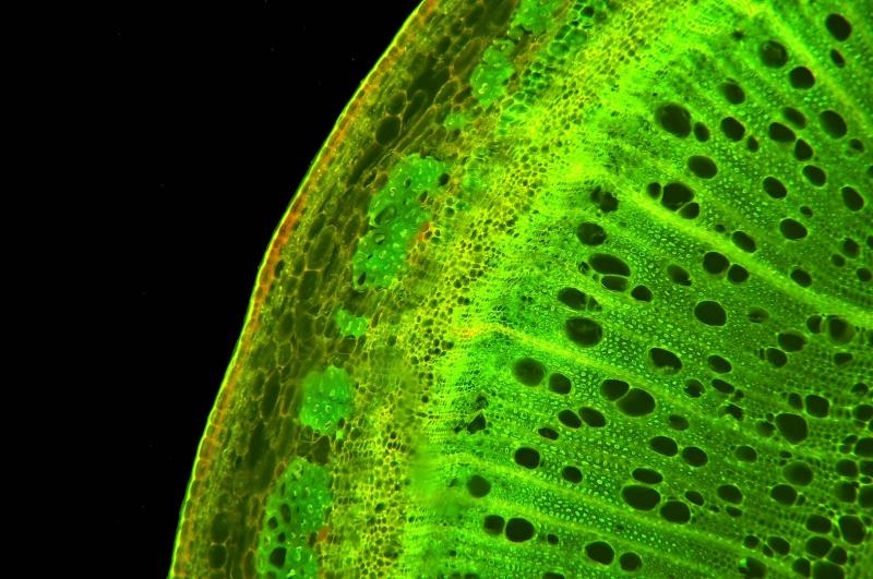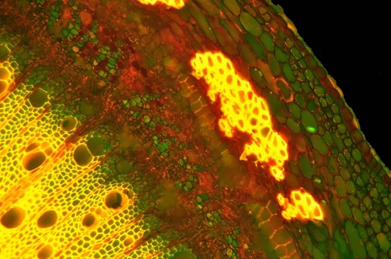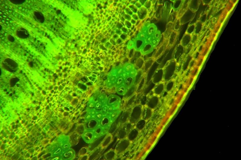 Bild 35 Schraubentracheen, Auflichtbeleuchtung Fluoreszenz, Virginische Blasenspiere Physocarpus opulifolius