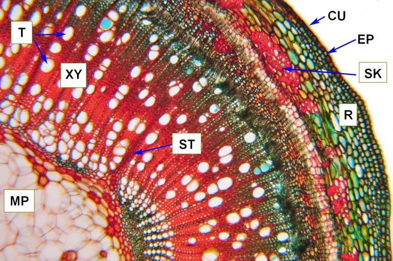T = Trachee, XY = Xylem, MP = Markparenchym, ST = Strahl, CU = Cuticula, EP = Epidermis, SK = Sklerenchym, R = Rindenparenchym