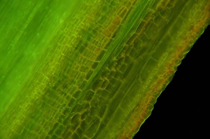 Zellwände blaugrün bis grün, verholzte Zellwände leuchtend rot, Zellwände der äußeren Hypodermis orangerot, Cuticula gelb, Zellwände der innenliegenden Hypodermis tiefrot.