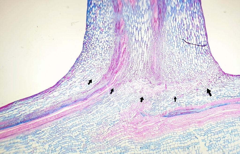 Übersichtsaufnahme; die Pfeile markieren die korkhaltige Schutzschicht, darüber erfolgt dann die eigentliche Abtrennung (Abscission).