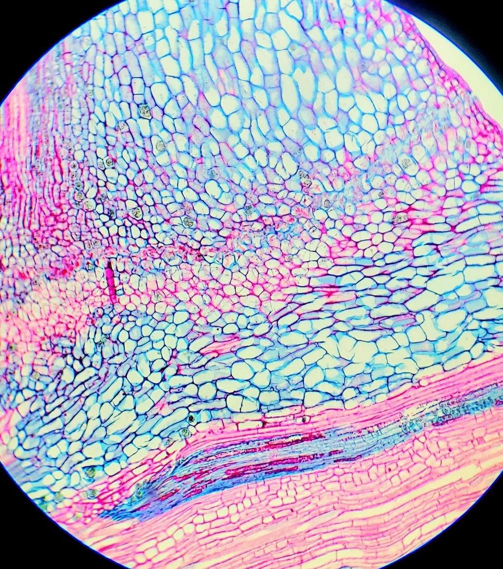 In diesen Schnitten sieht man die morphologischen Veränderungen an einer Weinrebe. Obwohl sich die Blätter schon leicht abtrennen ließen, ist die Schutzschicht noch nicht vollständig ausgebildet. Man erkennt das Einwachsen des Korkgewebes vom Rand und auch die Durchtrennung erster Leitbündel.