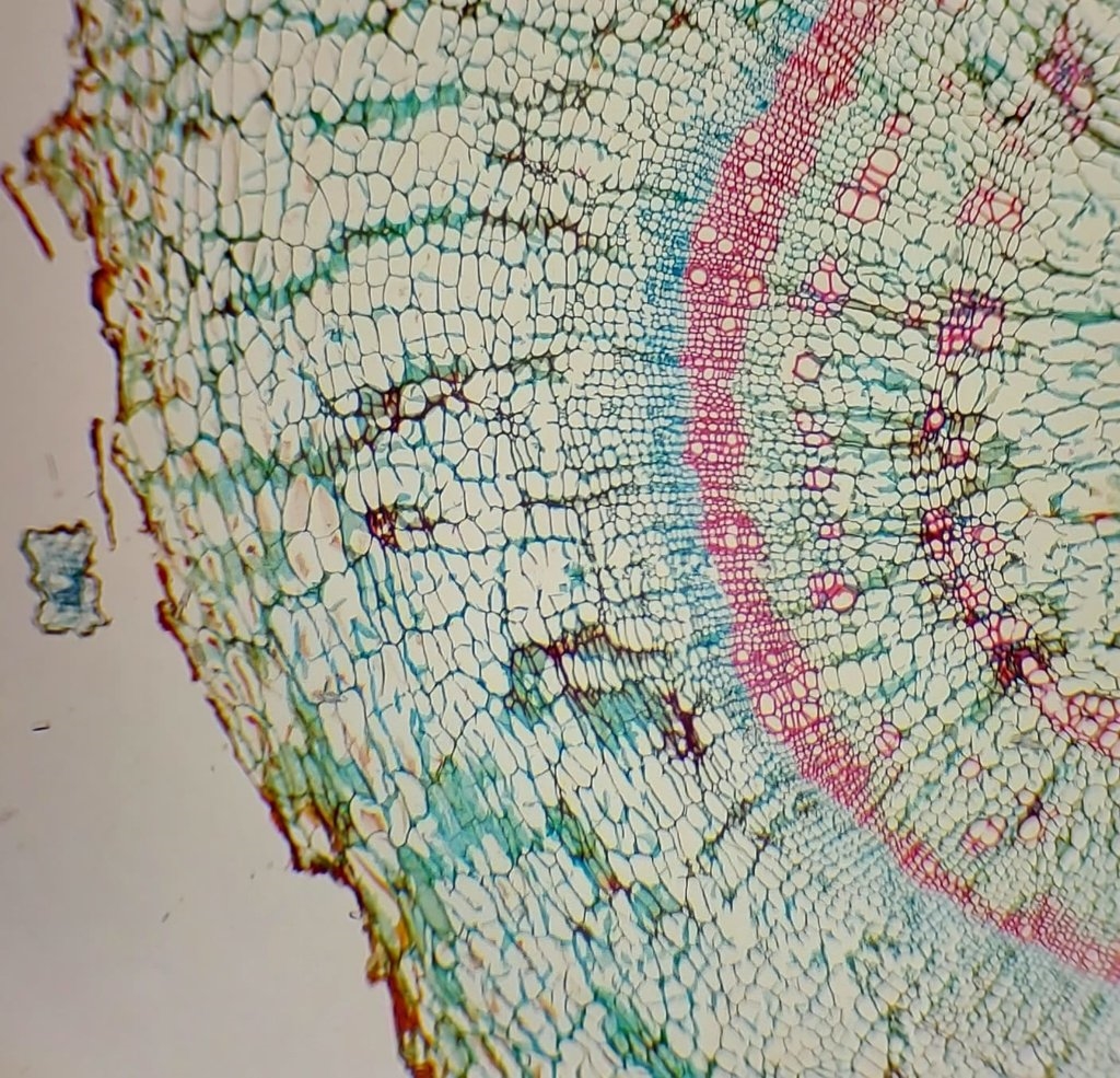Differenzieren 15s Sek. - 1 Minute in 96% Ethanol (Brennspiritus, das Fuchsin überfärbt ziemlich; je dicker und verholzter der Schnitt desto länger differenzieren unter mikroskopischer Kontrolle)