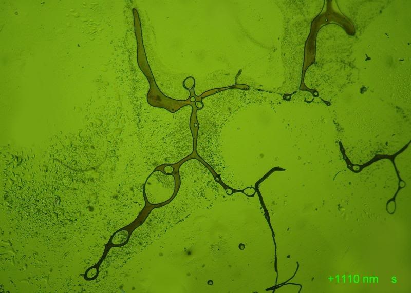 die Wasserspuren haben sich nach etwa 6 Monaten unter dem Deckglas gebildet; die Kristalle sind wohl hygroskopisch. Hat mich aber nicht weiter gestört - bei erneutem Erhitzen verändern sich die Strukturen.