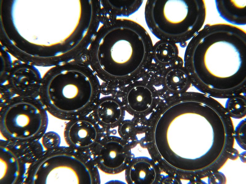 Ein paar Krümel der Substanz* auf einen Objektträger, Deckglas drauf.