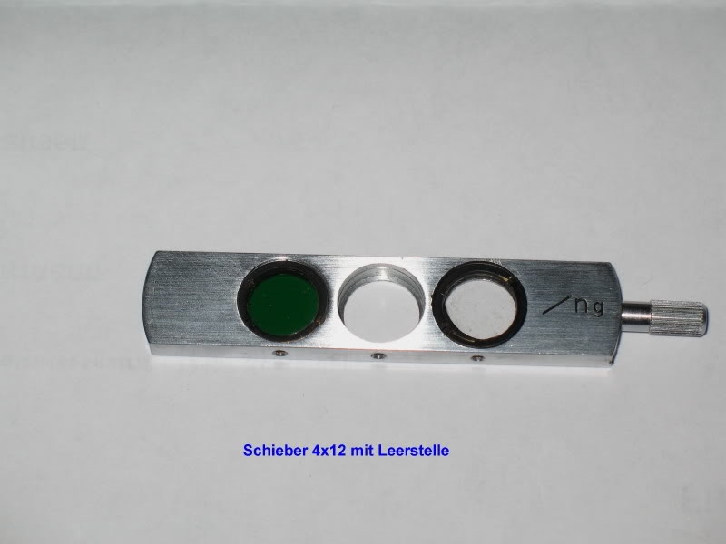 Fällt mit doch gerade auf dass mein Zwischentubusschlitz das Format 4x12 hat, sorry, ich war nicht ganz konzentriert. Und genau mit solch einem Format suche ich einen Leerschieber, denn ich will ja nach Senarmont kompensieren, und da brauch ich meinen drehbaren Analysator. Die große Aufnahme ist also schon vergeben, bleibt nur noch die kleine (4x12) im Zwischentubus. Ich habe einen billigen Kondensorträger mit Plastikhaltern unterm Kondensor, und eine Aufnahme für ein weiteres Präparat ist da leider nicht bei. Bleibt nur der Zwischentubus. Wenn also jemand einen Leerschieber 4x12 hat...