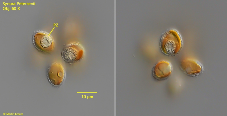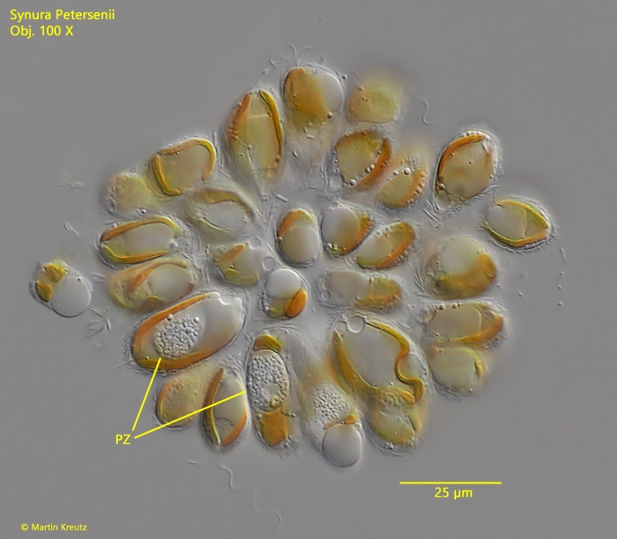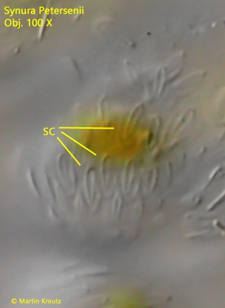 Bei allen befallenen Synura Kolonien handelte es sich um Synura Petersenii, was ich an der lanzettförmigen Schuppenform erkennen konnte:
