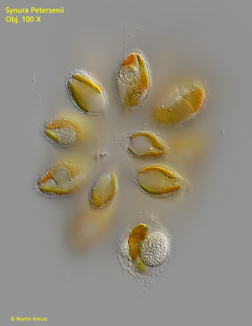 ich durchsiebe meine Fundorte ja schon ein paar Jährchen, aber in der ganzen Zeit ist mir noch nie ein Fall von einem Pilzbefall von Synura untergekommen, bis vor 2 Monaten. Gleich in mehreren Proben konnte ich die typischen Kolonien von Synura Petersenii finden, welche helle, granuläre Einschlüsse aufwiesen:
