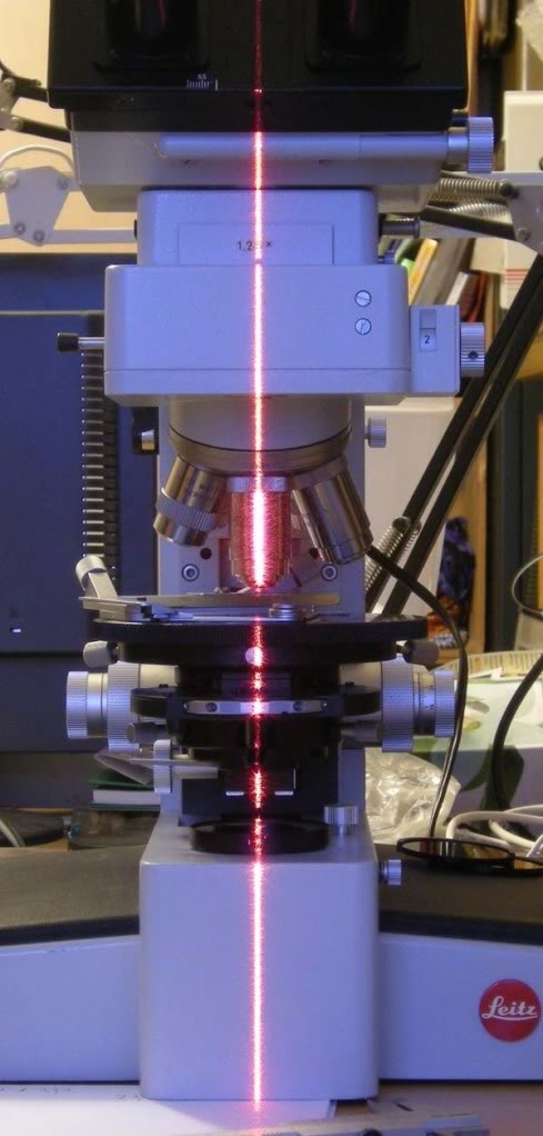 Ich habe eine Lasrlinie über das Gerät gelegt. Die Abweichung zwischen mittig eingestelltem Kondensor und Objektiv beträgt ca. 1,5mm
