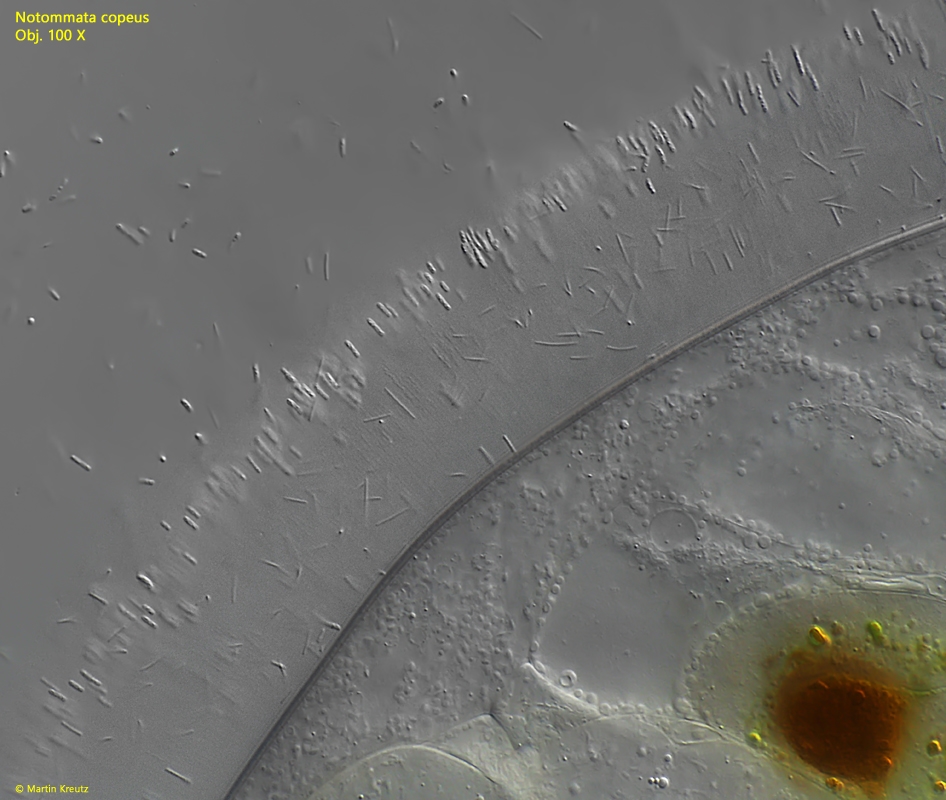 Die radiär aufgebaute Schleimhülle wird mit hoher Wahrscheinlichkeit von der Kutikula von Notommata copeus ausgeschieden. Die Bakterien sehe ich als Nutznießer dieser Nahrungsquelle. Sie haben offensichtlich keine symbiotische oder andere Bezeihung zu Notommata. Dies schließe ich aus dem Aufbau der Schleimhülle eines zweiten Exemplares von Notommata copeus. Hier fehlten die dünnen Bakterien (Bak 2) im Inneren der Schleimhülle: