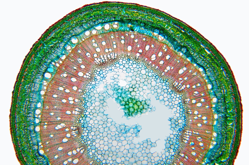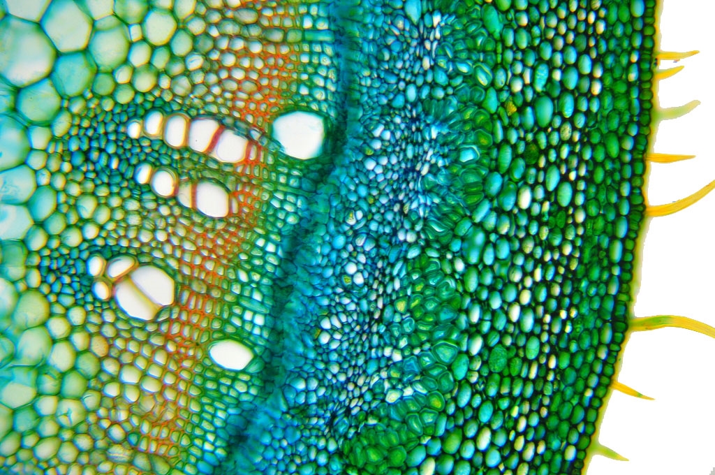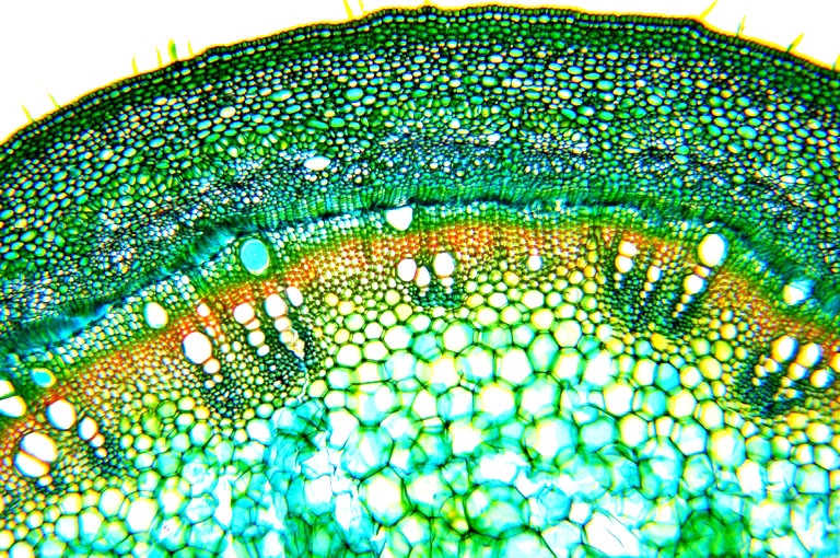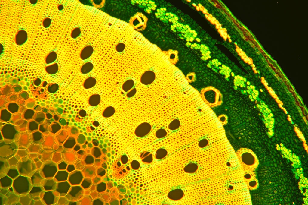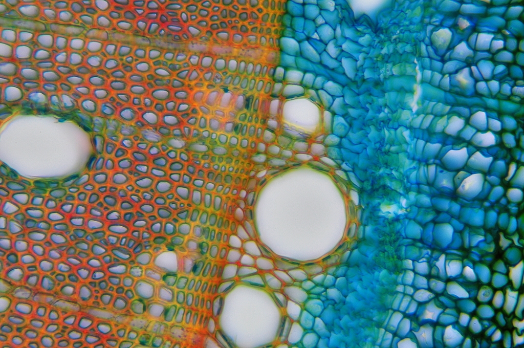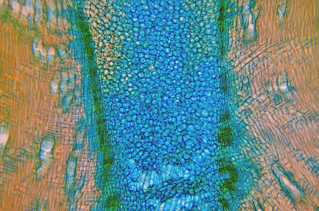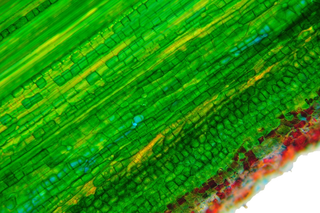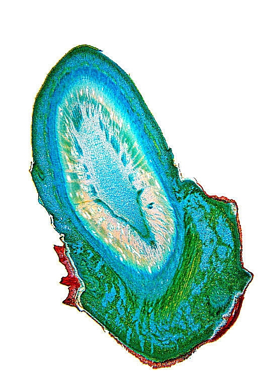 Zellwände blaugrün bis grün, verholzte Zellwände leuchtend rot, Zellwände der äußeren Hypodermis orangerot, Cuticula gelb, Zellwände der innenliegenden Hypodermis tiefrot.