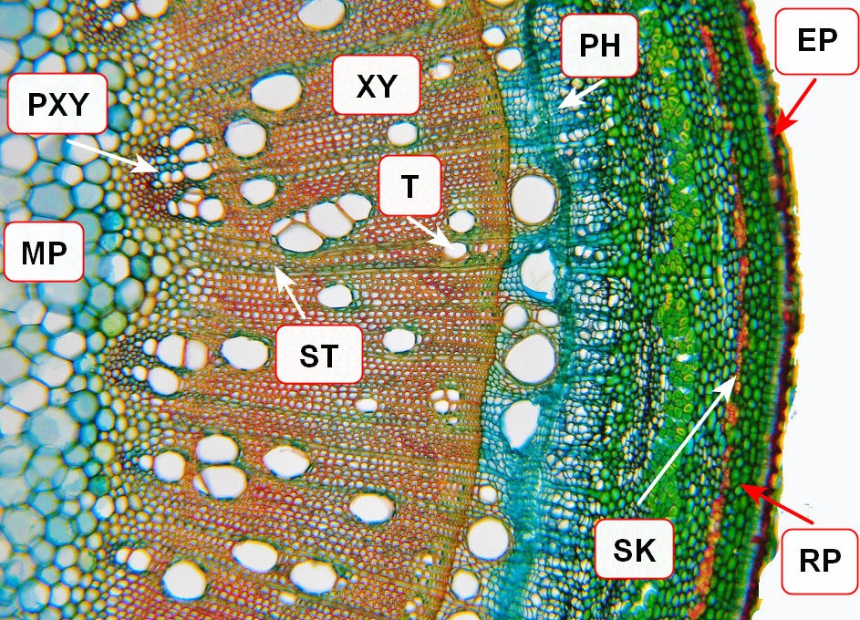 PXY = Protoxylem, MP = Markparenchym, St = Strahl, XY = Xylem, T = Trachee, PH = Phloem, SK = Sklerenchym, RP = Rindenparenchym, EP = Epidermis