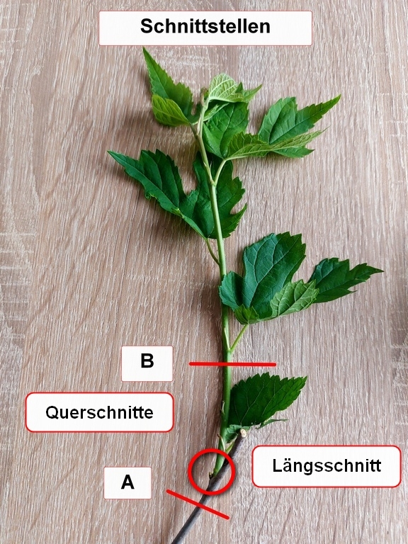 A = älterer Spross, B = junger Spross