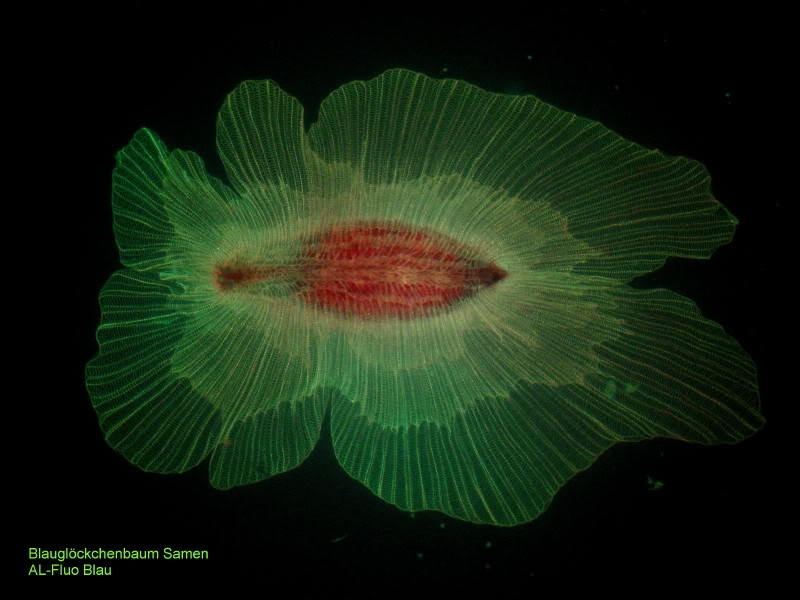 da ich gerade den Fluoreszenzschieber drin hatte habe ich gleich noch den mit PAS gefärbten Flugsamen des Blauglockenbaums aufgenommen.