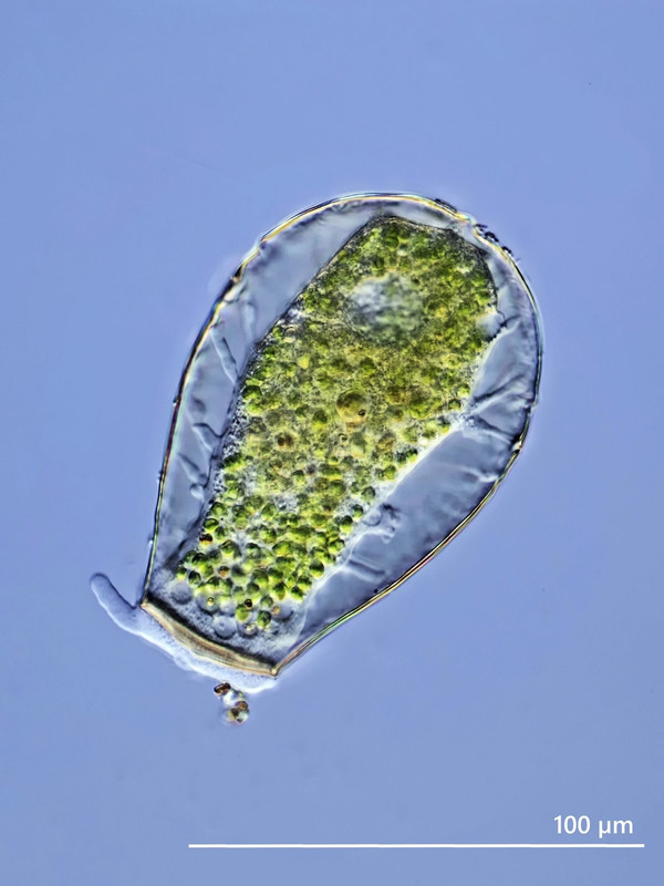 das ist Hyalosphenia papilio, welche ich ebenfalls beim Pillersee Treffen gefunden habe. Die Bilder harren ihrer Bearbeitung jedoch noch in der Kamera. Das sind keine phagozytierten Grünalgen in Hyalosphenia, sondern Zoochlorellen. Sie sind konstant in allen Exemplaren vorhanden.