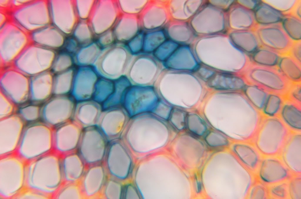 Zellwände blaugrün bis grün, verholzte Zellwände leuchtend rot. Zellwände der äußeren Hypodermis orangerot, Cuticula gelb