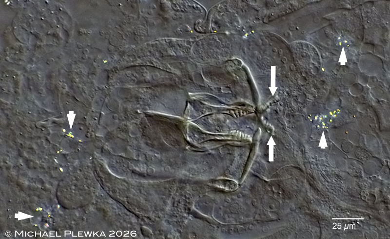 Bei dieser  Art  (Dicranophorus hauerianus) , die man an sehr charakteristischen Strukturen des Kauers (Pfeile) von anderen Arten unterscheiden kann,  habe ich bisher noch nie tierische Überreste im Mageninhalt gefunden, sehr wohl aber jede Menge Diatomeen. Ich habe dieses Bild, (das die Kauer im übrigen nur unzulänglich dokumentiert) aber deshalb ausgewählt, weil es zusätzlich an manchen Stellen die Anhäufungen von kleinen lichtbrechenden  Körperchen unbekannter Funktion zeigt, ähnlich denen, die ich bei einer   anderen Art aus dieser Gattung schon beobachtet hatte.