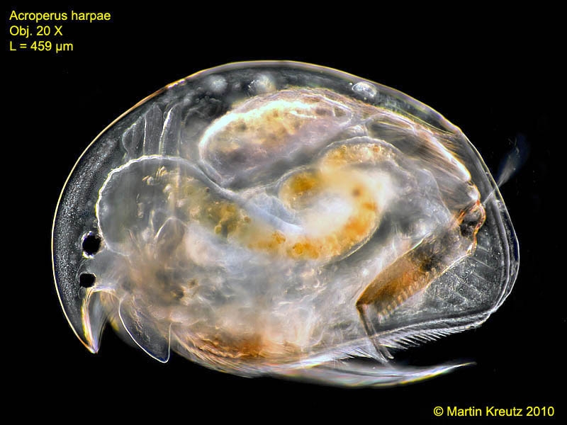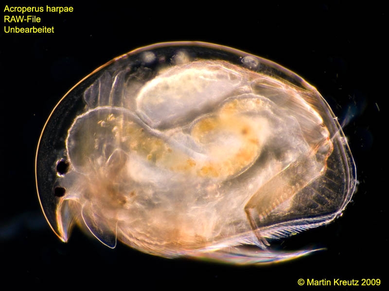 hier eine DF-Aufnahme vom Sichelkrebschen Acroperus harpae. Die Art wird als sehr häufig beschrieben, aber in meinem Fundgebiet eher selten anzutreffen. Ich wollte das Exemplar eigentlich mit ausgestreckter Furkalkralle fotografiert haben, aber mein Model hat da nicht mitgemacht! So musste ich mit dieser Aufnahme vorlieb nehmen!