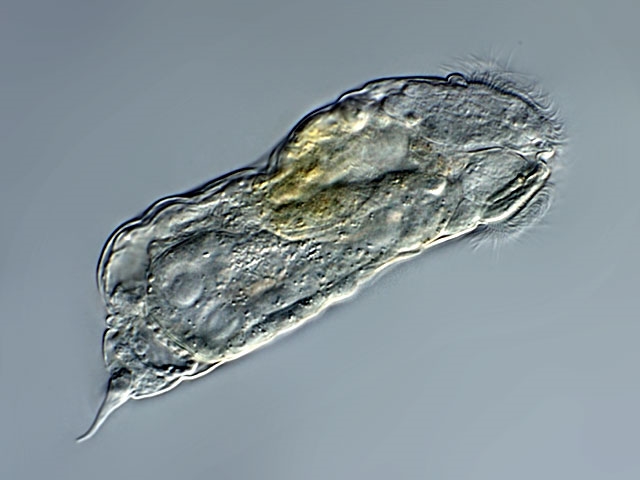 Innerhalb der Wirtskolonie ziemlich ruhig, ist es, wenn die Kolonie durch Deckglasdruck beschädigt wird und damit das Tier vertrieben wird, außerhalb ein sehr schneller Schwimmer. Es handelt sich dabei um Cephalodella edax.  Dass diese  erst 1993 erstmalig aus England beschrieben worden ist, finde ich sehr seltsam.  Insofern wäre es interessant zu wissen, wo es in Deutschland verbreitet ist. C. edax ist augenlos und  desweiteren durch eine gedrungene Gestalt mit aufwärts gebogenen Zehen charakterisiert.: