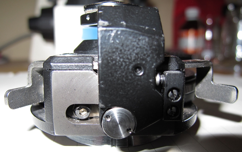Dann mit einem Filzstift einen Tupfer mitten auf der Frontlinse des Kondensors machen (unter einer guten Lupe kontrollieren und ggf. korrigieren) und mit schwacher Vergrößerung auf diesen fokussieren. Falls nun diese Markierung nicht mittig im Blickfeld liegt (bei verschiedenen Vergrößerungen testen), diese Frontlinse zentrieren.