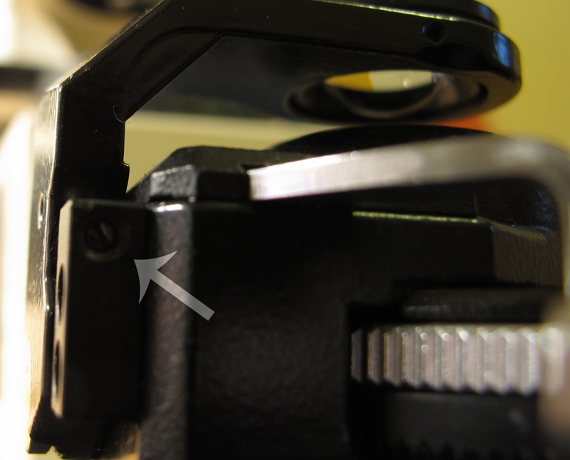 Am Frontlinsenbügel sehe ich auch schon die Madenschrauben, die man lösen muß, um diese zu verrücken und nach Anziehen wieder neu zu fixieren.