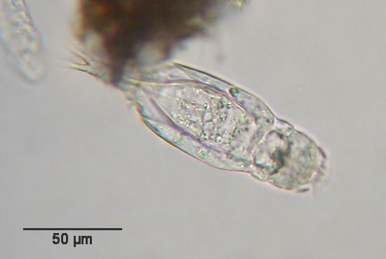 Na dann: Cephalodella ist es wahrscheinlich nicht, müßte gebogene Zehen haben. Aber eine weitere Bestimmung ist kaum möglich; es liegt auch unpassenderweise Detritus drüber... Kamma nix machen...