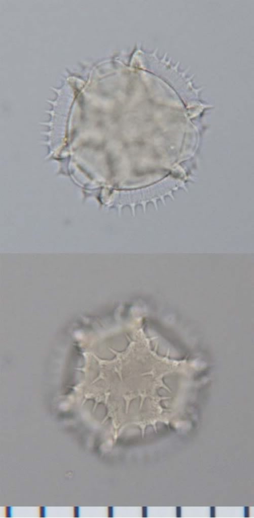 Die Pollenbilder sind Einzelbilder. Sie wurden am Leitz Ortholux mit dem Pv Apo. 40x n.A. 0.75 gemacht. Die Pollen sind noch nicht bestimmt.