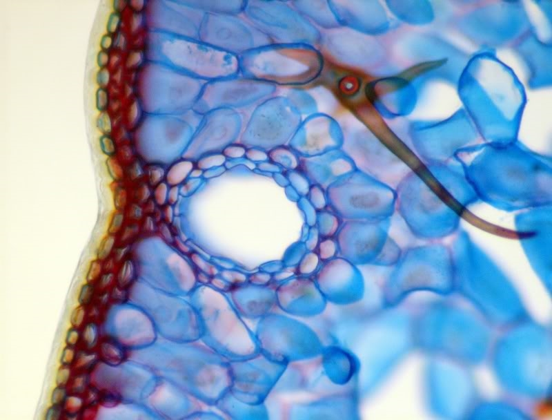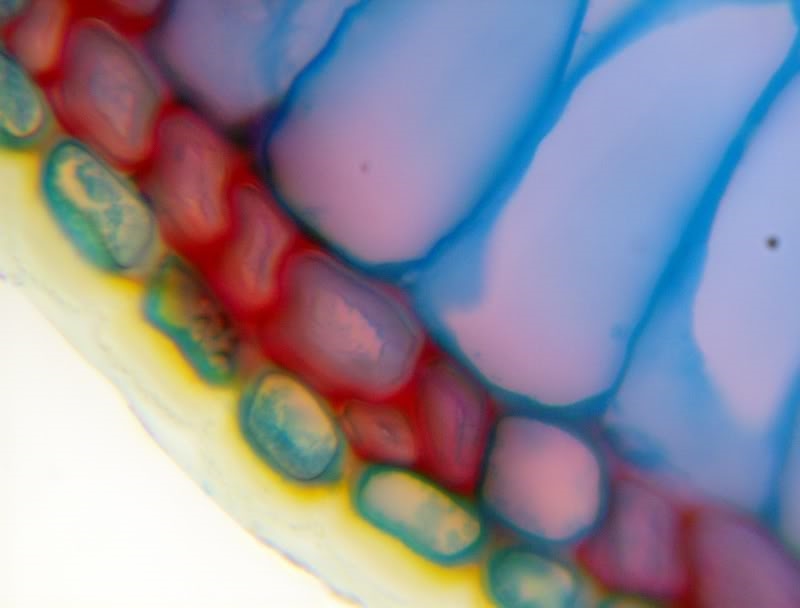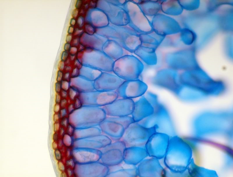schön, dass euch mein Schnitt gefällt.  :)Ich denke auch, dass die Idioblasten erst durch die Nachfärbung mit Chrysoidin ( 1%) so schön kontrastreich wurden. Parallel zu diesem Schnitt habe ich noch den Ansatz des selben umgewandelten Seitensprosses  ;) an der Sprossachse präpariert. Erstaunlicherweise waren noch keinerlei Idioblasten erkennbar.
