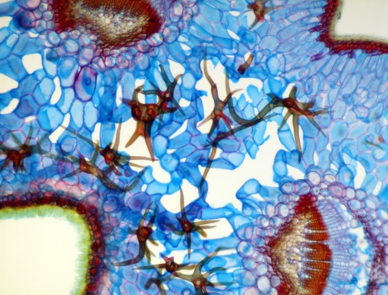 ein sehr schöner Schnitt und eine interessante Färbung! Die Astrosklereiden habe ich noch nie so differenziert angefärbt gesehen.