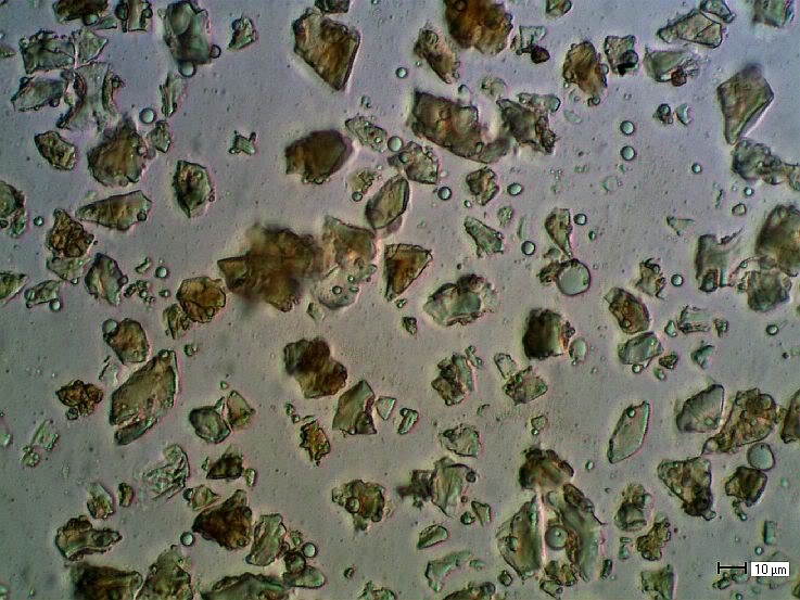 ich habe gerade mal Scheuermilch unter dem Mikroskop betrachtet und bin verblüfft, wie ähnlich sie meinem Präparat sieht. Makroskopisch betrachtet besteht jedoch gar keine Ähnlichkeit und keiner käme auf die Idee, damit seine Küche zu putzen; allerdings kommt das Zeugs wahrscheinlich in fast jeder Küche vor ;).