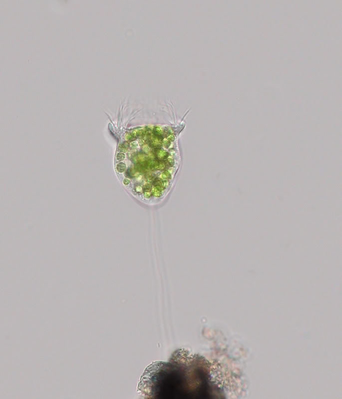 Zunächst fand ich erstmals Vorticella chlorellata (~60µm ohne Stiel), das auf planktischen Blaualgen lebt.
