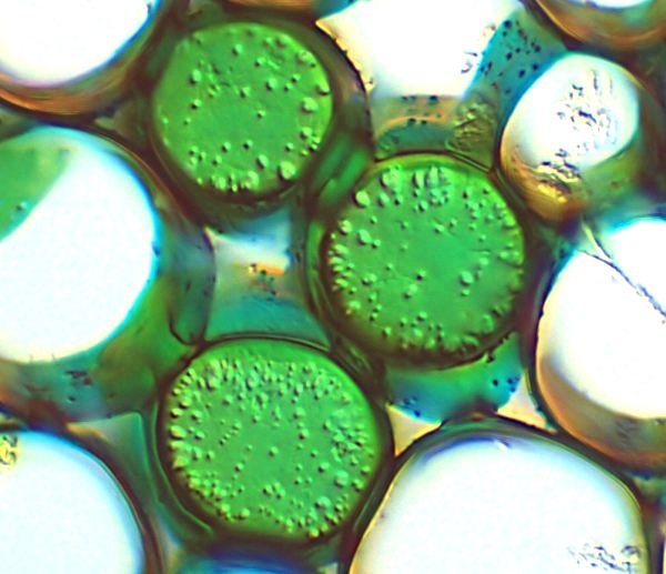 Diese sind hier aber vorhanden, daher vermute ich, dass das Bild Gewebe aus dem Rinden- oder Markparenchym zeigt. In diesem Falle sehen wir Tüpfel, die durch den DIC-Einsatz optisch hervorgehoben werden.