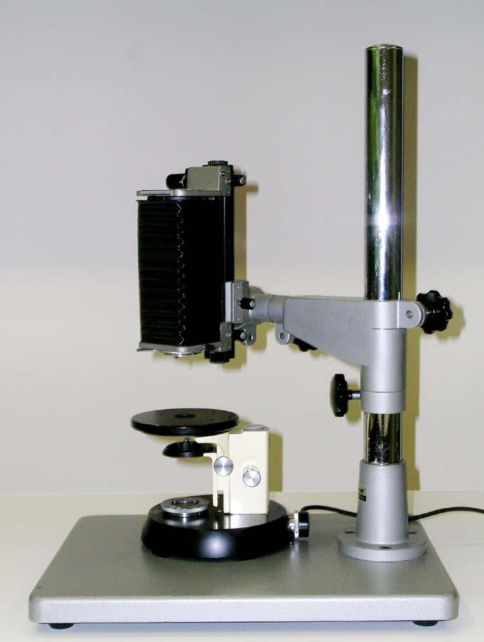 Verwendet wurden zwei defekte Mikroskopstative. Ein Zeiss Winkel GFL gab sein Fuss mit der Lichtführung und ein Wild M11 seinen Stativteil mit Feintrieb, Tisch und Kondensorhalter. Der Feintrieb ermöglicht pro Umdrehung eine Bewegung von 12 Hundertstel mm. 18 Umdrehungen sind möglich. Der runde Tisch hat einen Durchmesser von 125mm die Öffnung für das Durchlicht beträgt 25mm. Eine Durchlichtbeleuchtung mit der vorhandenen 6V 15Watt Leuchte ist möglich.