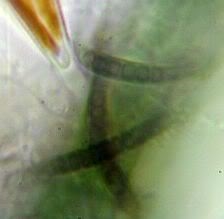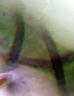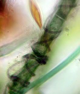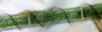 Lyngbya epiphytica, Zellen...fast quadratisch, Fäden leben...auf anderen Algen und umschlingen diese in mehr oder weniger regelmäßigen Windungen. Dürfte hier zutreffen!