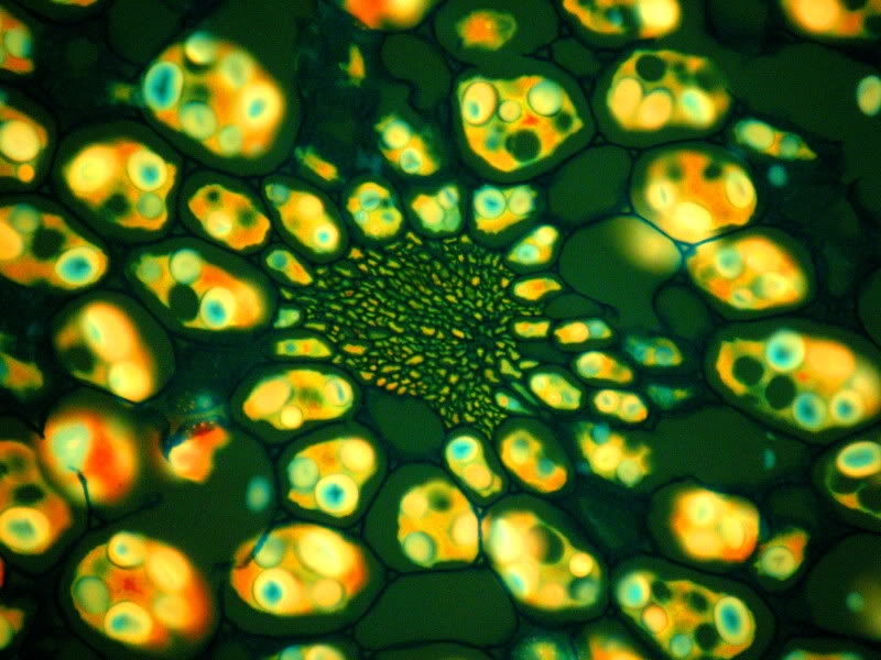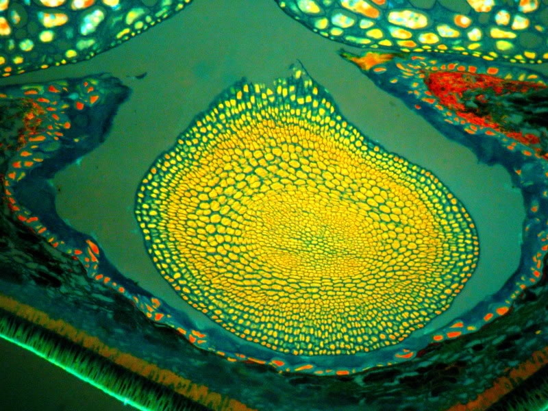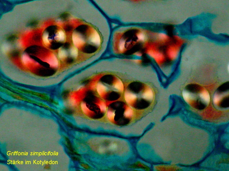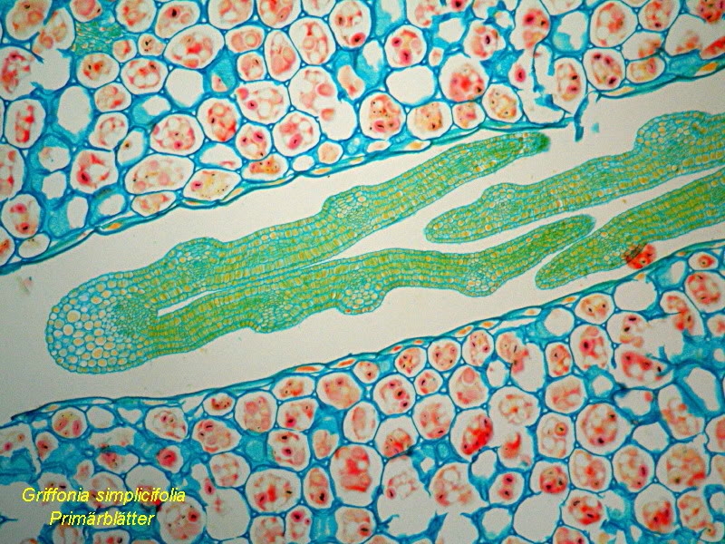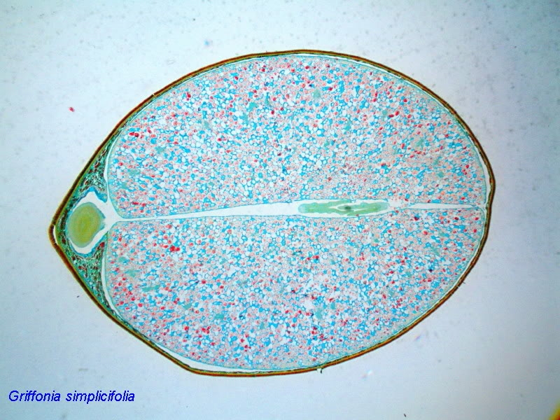 2 pfiffige Würzburger "Nachwuchsmikroskopiker" haben das Rätsel gelöst und jetzt im Nachgang auch noch schöne Schnitte nachgeliefert. Als Beispiel wurde die afrikanische Schwarzbohne Griffonia simplicifolia herangezogen. In AFE fixiert. Paraffineinbettung 8 µm und mit Wacker W- 3A gefärbt