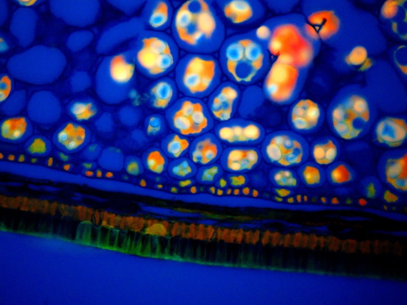 Im letzten Bild ist diese palisadenförmige Epidermis schön zu sehen, darunter die gelbe Schicht ist wohl eine Hypodermis, darunter liegt noch eine weitere Schicht. Alles zusammen ist die Bohnenschale. Dann folgt das dicke Keimblatt, üppig ausgestattet mit Reservestärke.