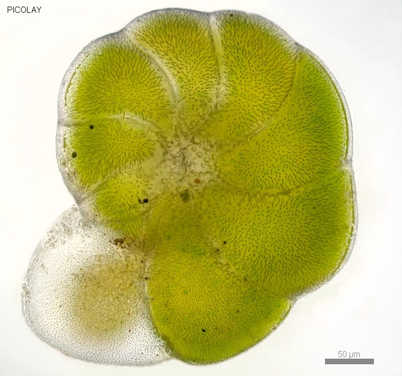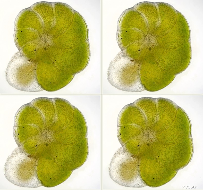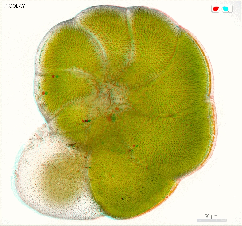 nicht nur schöne Kieselalgen gibt es im Watt, sondern auch Mikroorganismen mit Kalkschalen. Die sieht man allerdings nicht mehr nach Behandlung mit ätzender Säure. Hier eine Foraminifere aus dem Jadebusen bei Dangast, unbehandelt und deshalb nicht piekfein sauber. Dafür aber in 2- und 3D. Foraminiferen, auch Kammerlinge genannt, sind Einzeller, die eine beträchtliche Größe erreichen können. Sie bilden, wenn sie größer werden, einfach eine neue Kammer, so dass sich eine Art Schneckenhaus ergibt. Weshalb die hier gezeigte so grün ist, weiß ich nicht. Eigentlich leben Foraminiferen nicht nicht phototroph.