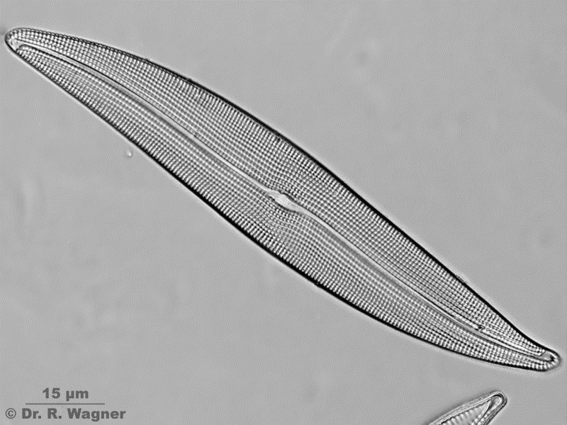 Länge: 123 µm, Breite: 19 µm; 10 Streifen auf 8 µm, 10 Poren auf 8 µm.