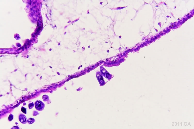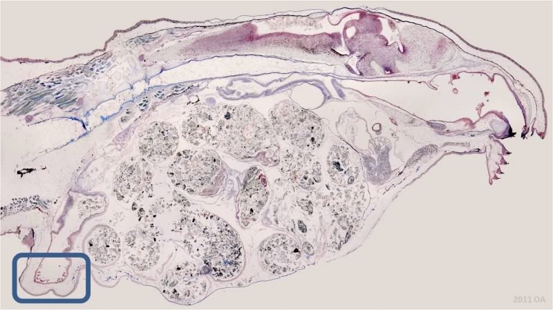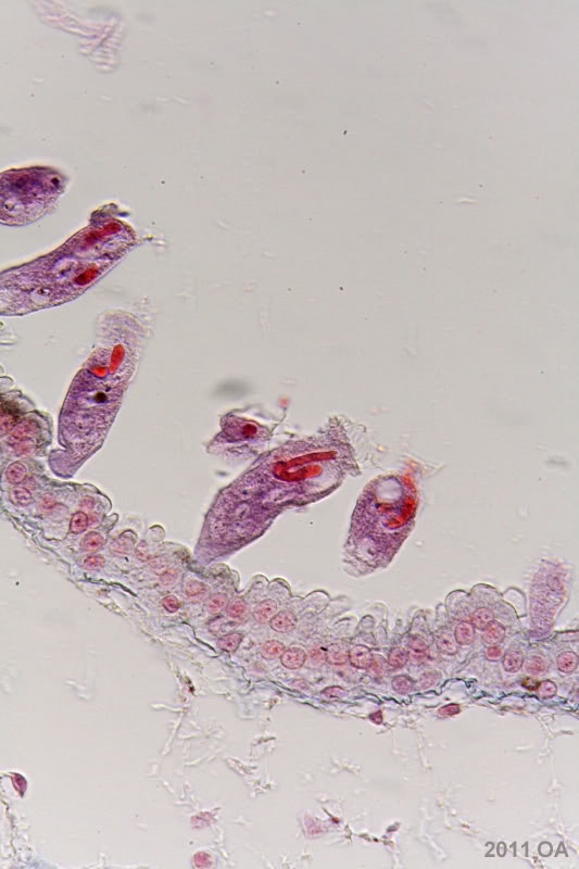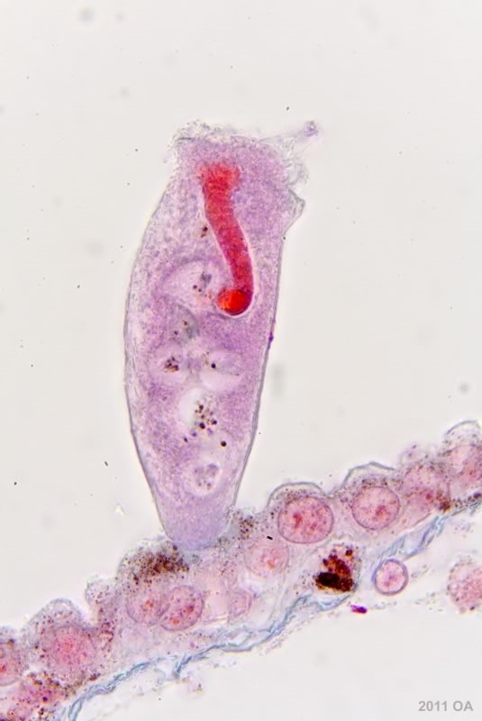 Zu meiner Überraschung fand ich in der Kaulquappe diverse Ciliaten. Sowohl die Cilien als auch der schlangenförmige Makronukleus sind im Schnitt erkennbar. Eine kurze Internetrecherche zeigte, dass Ciliaten sowohl im Darm als auch der Kloake von Anuren vorkommen können (z.T. parasitisch).