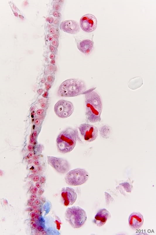 Das Azokarmin hast Du sehr schön differenziert. Erstaunlich, dass die Protozoenkerne noch so viel Farbstoff enthalten. Offenbar ist die DNA hier stärker kondensiert, während bei der Kaulquappe wohl relativ viel DNA abgespult und transkribiert wird, daher ist das Chromatin hier wesentlich offener. Sogar die Kerntrümmer in den Nahrungsvakuolen der Ciliaten sind noch stark gefärbt.