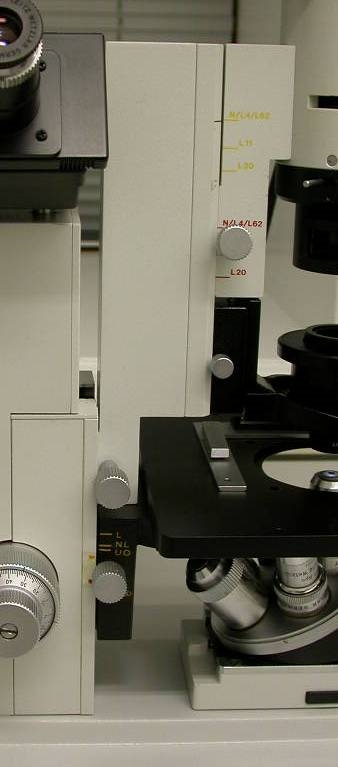 Same for the indicators for the stage height. Normal is the NL marking against the yellow arrow, that brings the focal plane of 45mm objectives roughly at the stage surface. But what's the red arrow for? Is there a connection to the red and yellow markings on the illuminator?