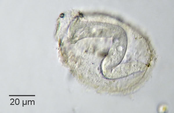 wahrscheinlich hast Du, lieber Jan, mit Deiner Vermutung Recht. Ich fand das Viech nämlich in einer Probe mit Teichlinsen. Lieber Ernst, Deckglasdruck ist in diesem Fall unmöglich, denn ich hatte ohne Deckglas mikroskopiert, um Diatomeen zu isolieren. Deshalb ist die Aufnahme auch etwas verschwommen.
