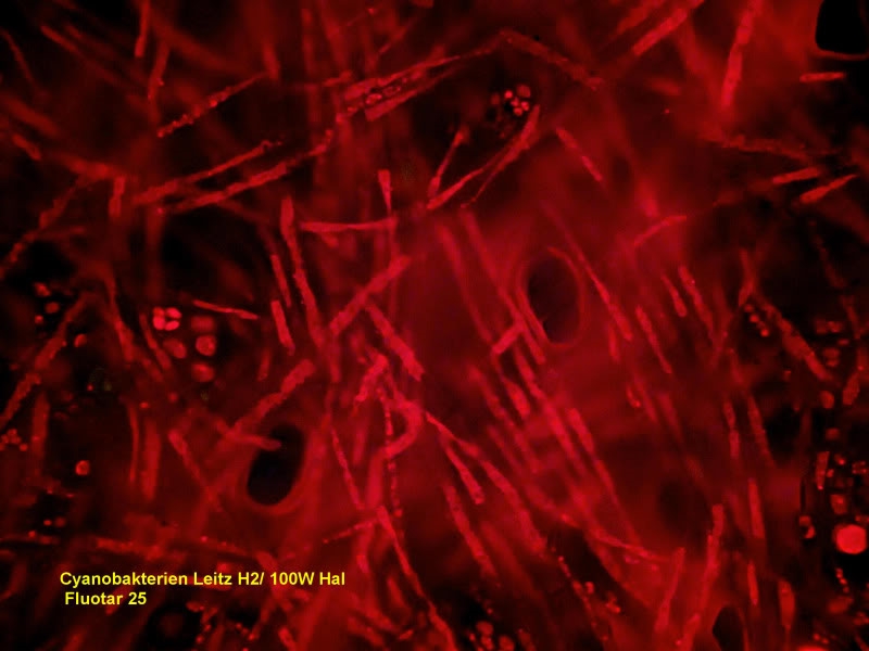 Mit einer HBO 100W beleuchtet habe ich am Zeissmikroskop mit einem fast vergleichbaren Filterblock die Chlorophyllfluoreszenz gut beobachten können. Aber mit Halogen 100 W am Leitz mit dem H 2-Filterblock ist es nicht gut!