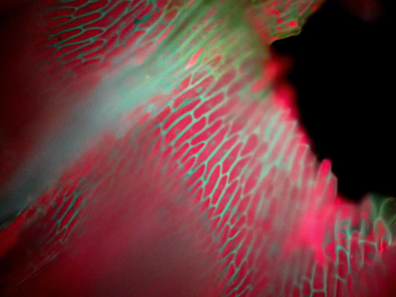 Die Fluoreszenz ist sehr schwach. Die Aufnahme wurde mit 1600 ISO gemacht. Das Scharfstellen ist nicht einfach. Ein Moosblatt zum Vergleich geht nicht mehr, die Fluoreszenz ist noch schwächer.