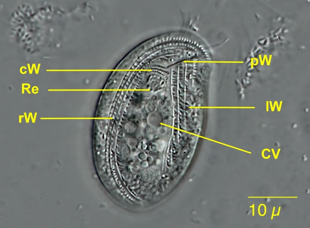 Es bedeuten im 1. Bild: Circumorale Wimpernreihen (cW), Reuse (Re), rechtes Wimpernfelds (rW), die Präorale Wimpernreihe (pW), linkes Wimpernfeld (lW), sowie die Kontraktile Vakuole (KV).