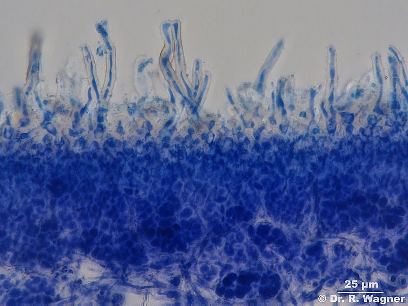 - Querschnitt Lobe. Aufrecht stehendes Tomentum. Färbung mit Lactophenol-Methylblau-Acidfuchsin
