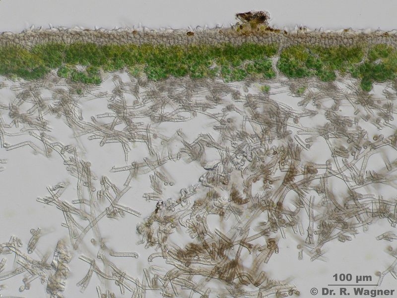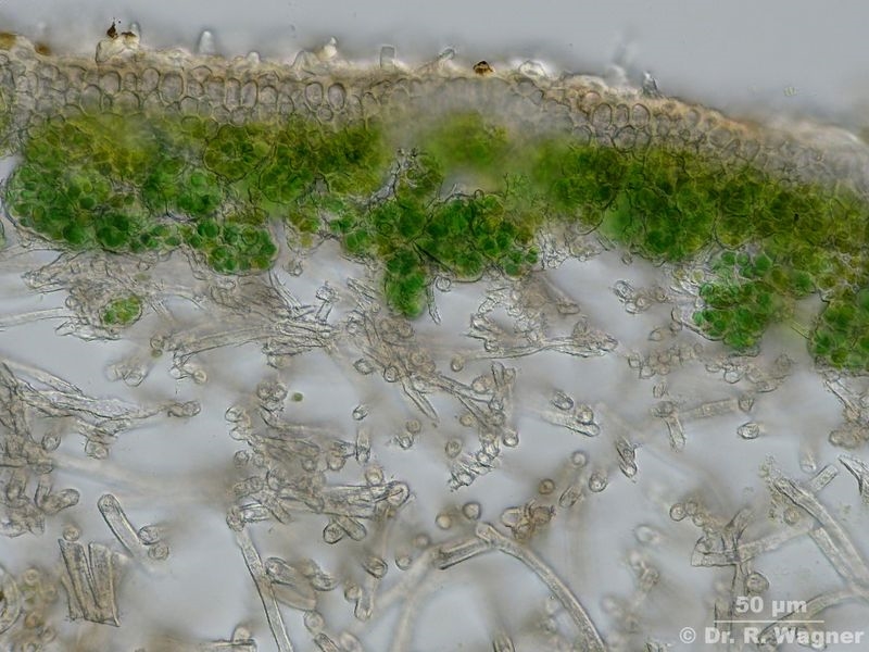 - Querschnitt Lobe, Nahansicht Cyanobakterien (Nostoc) und obere Rinde