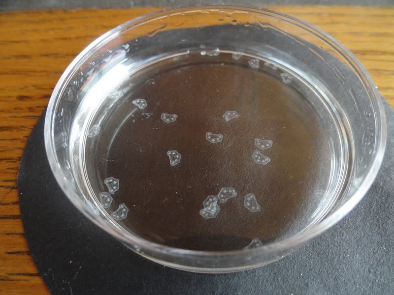 7.  Acriflavinlösung (differenzieren bis gerade keine Farbwolken mehr abgehen- Lupenkontrolle)     ca. 10 Sekunden.