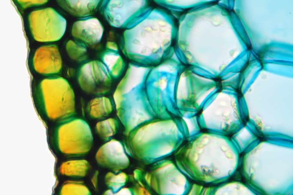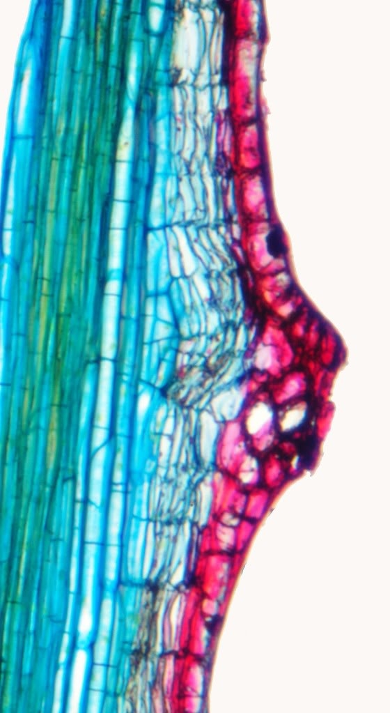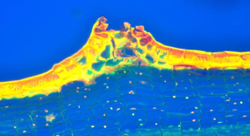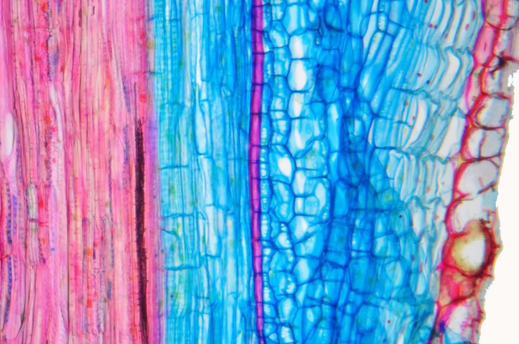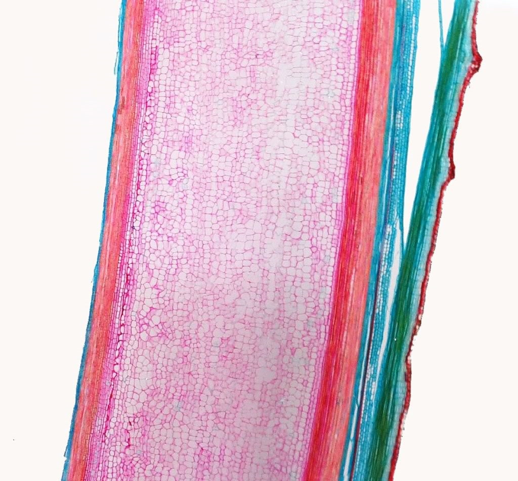 Zellwände blaugrün bis grün, verholzte Zellwände leuchtend rot. Zellwände der äußeren Hypodermis orangerot, Cuticula gelb. Zellwände der innenliegenden Hypodermis  tiefrot, Suberin  hellrosa.