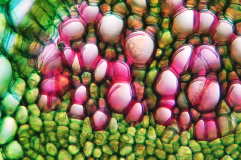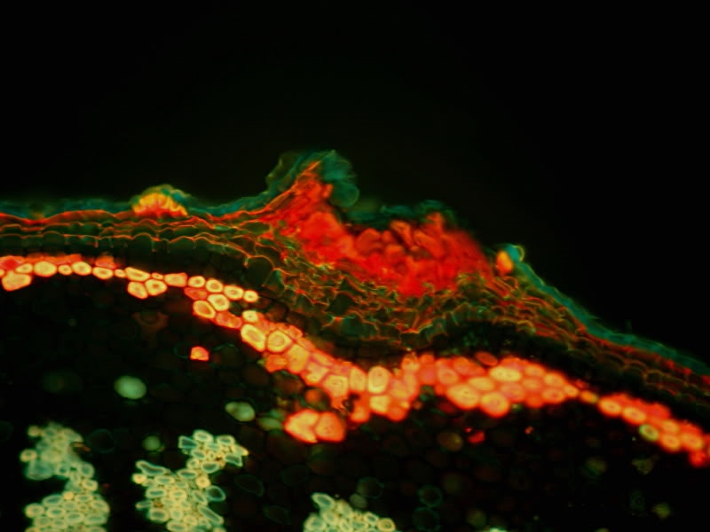 Die W 3 A-Färbung ist für Fluorszenz schön geeignet. Ich habe hier mit Blauanregung bei Trachelospermum jasminoides  eine etwas andere Fluoreszenz erzielt: Eingedeckt in Malinol, das kaum Eigenfluoreszenz zeigt.