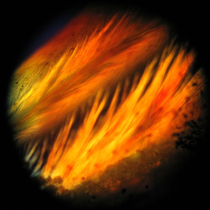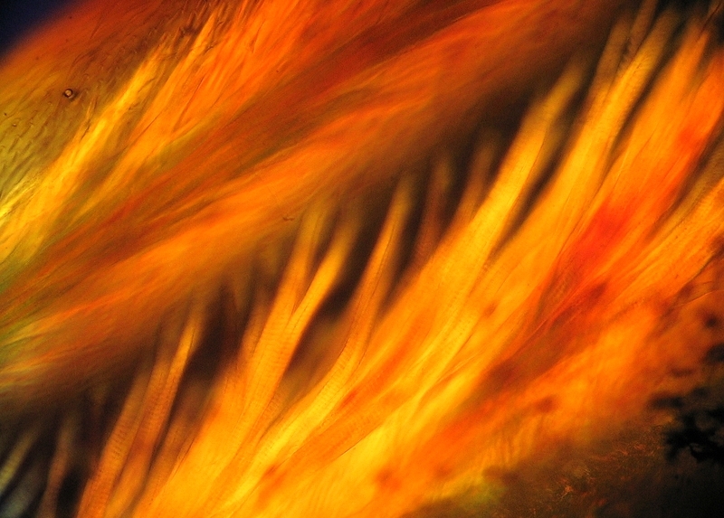 Die Aufnahmen von Muskelsträngen im polarisierten Licht sind immer wieder schön. Selbst durch den Chitinpanzer hindurch kann man noch wunderbar sehen, dass der Muskel sich in einzelne Stränge auffächert, die quergestreift sind. So wunderbar bekommt man das sonst nur durch umfangreiche Präparation, z.B. mit Eisenhämatoxyilin, hin.